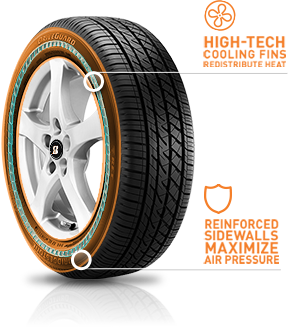 What makes Bridgestone tires so tough? Reinforced sidewalls maximize air pressure, while high-tech cooling fins redistribute heat to help the tire maintain the proper temperature. Then, the Tire Pressure Monitoring System (TPMS) alerts you about the flat. This innovative tire technology gives you more time to safely reach your destination.